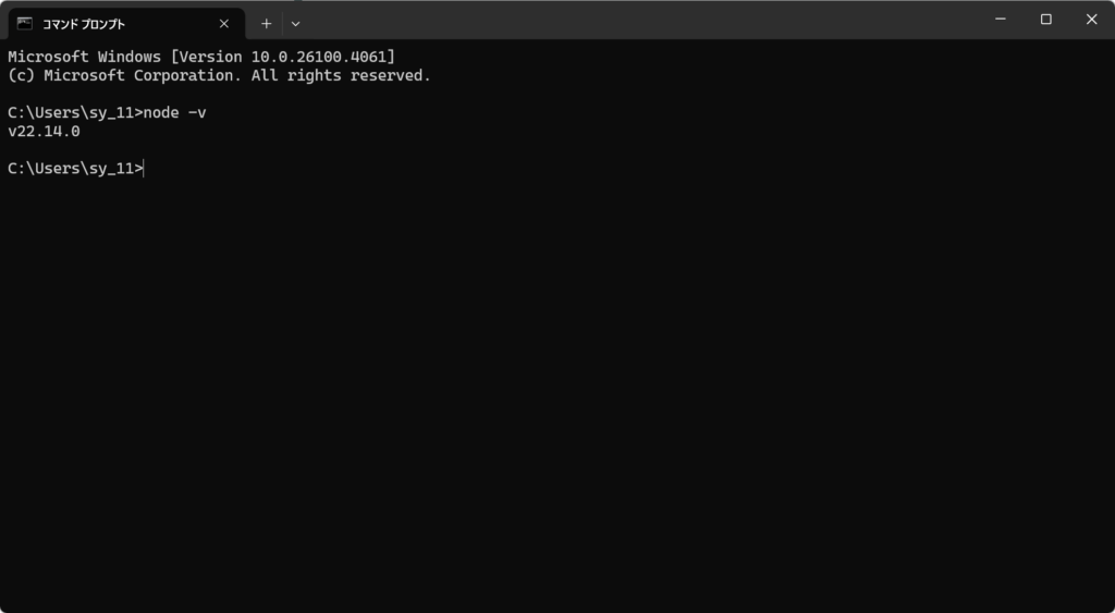 コマンドプロンプトでnode -vを入力して、Node.js バージョン20以上がインストールされているかを確認しましょう。