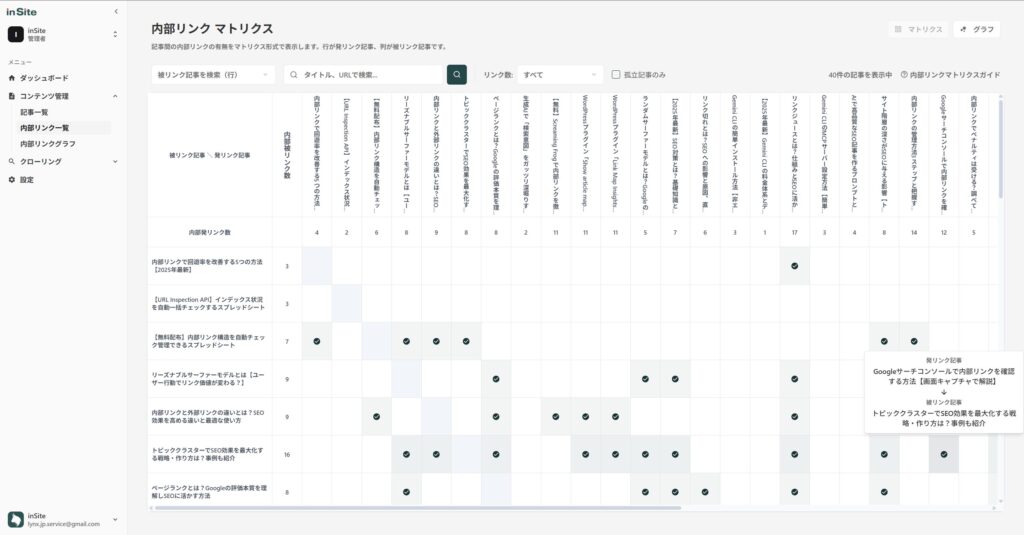 サイト管理・内部リンク管理ツール inSite(インサイト)は、合同会社LYNXが提供している内部リンクをチェックできるツールです。