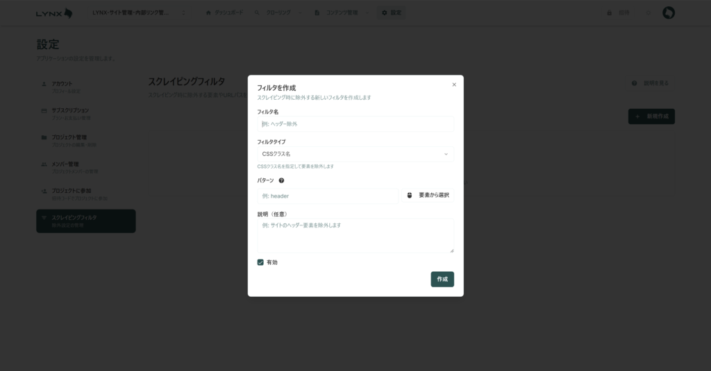 フィルタ機能では、クローリング時に除外するクラス名・HTML ID属性・HTMLタグ・URLを設定することができます。